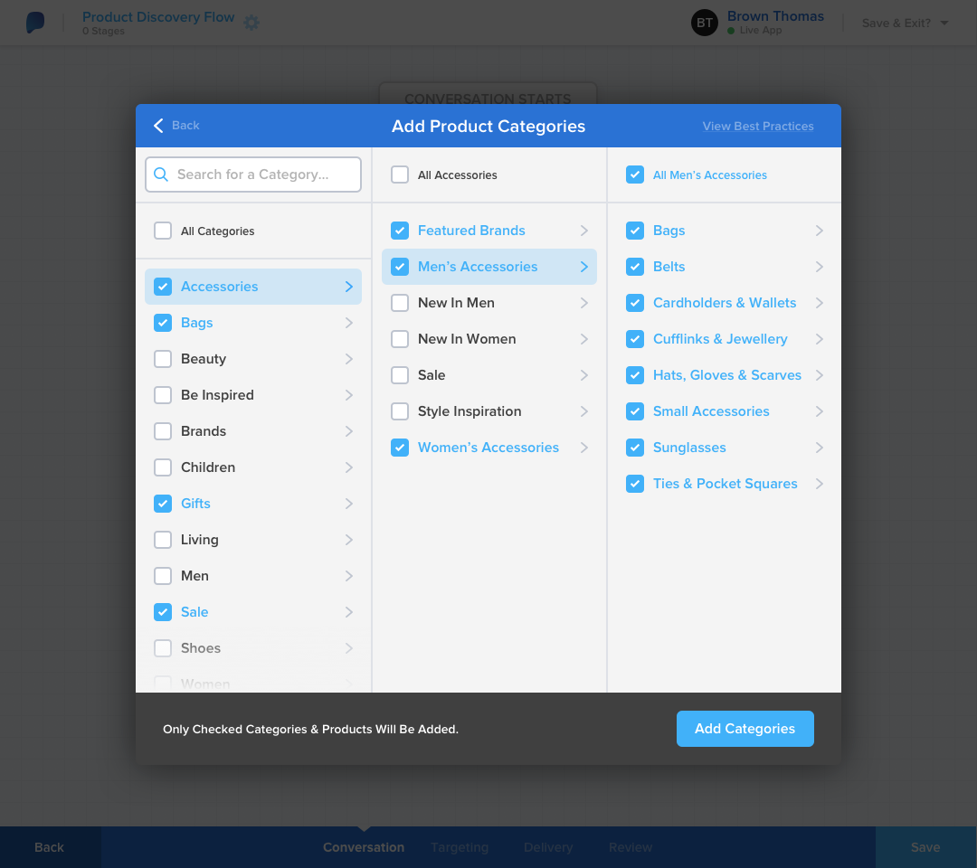 - Selecting multiple product categories, as a way of quickly adding the product cards associated within specific categories